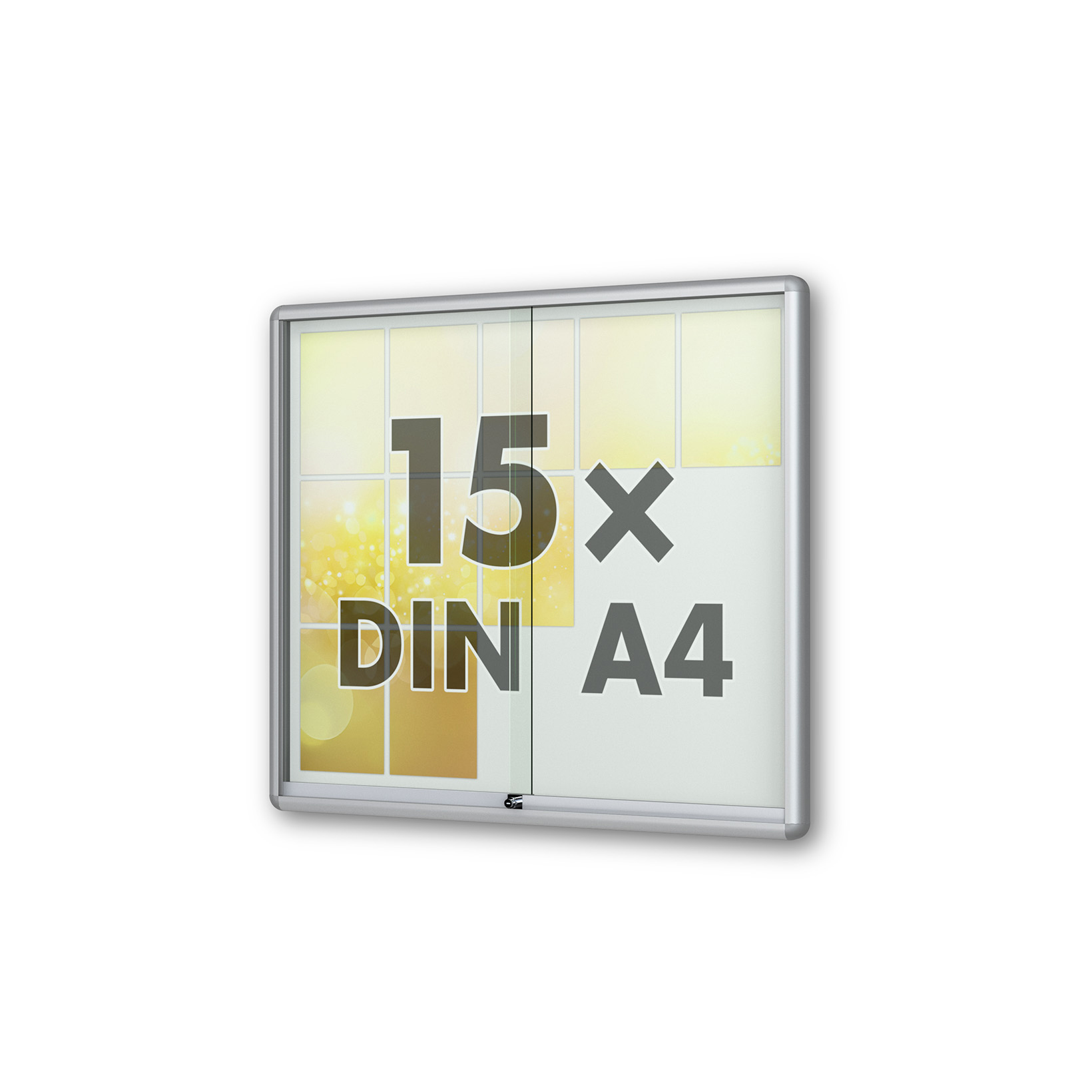 15 x DIN A4 Schaukasten Moveo - "die Schulvitrine" - mit Brandschutzklasse A1 - Rollengelagerte Schiebetüren✓ abschließbar✓ ESG-Sicherheitsglas✓