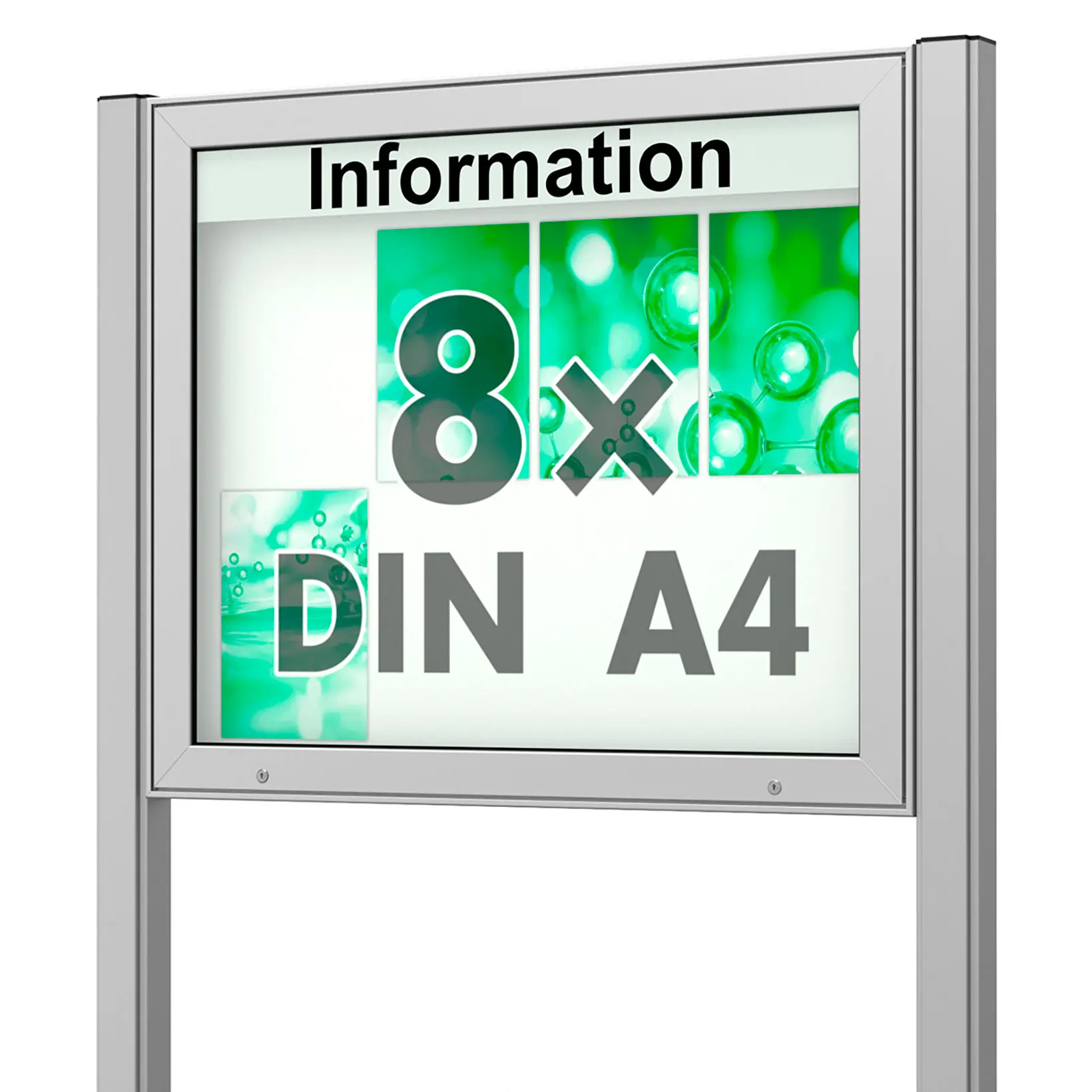 8 x DIN A4 Schaukasten Plenum eckig - der "Klassiker" mit Solar-Modul und Pfosten - Bautiefe 100mm