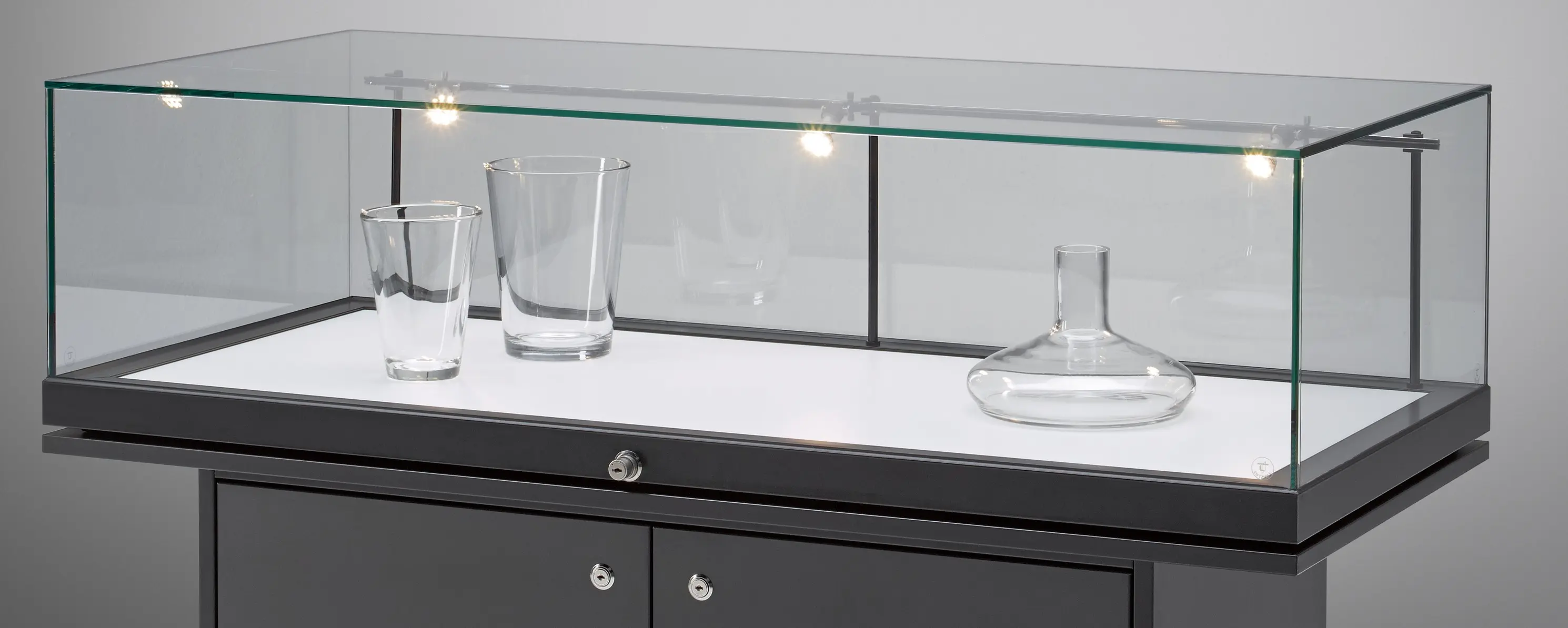 Tischvitrine Glas mit abschließbarem Unterschrank Rahmenlose Ganzglas-Konstruktion mit 8mm ESG-SicherheitsglasUnsere Stauraum-VitrineDesign-Vitrine für Museen, Ausstellungen oder das exklusive Büro Unterschrank aus beschichteter Holzplatte Größen B/H/T1000 × 970 × 500 mm1200 × 970 × 500 mm1400 × 970 × 500 mmHöhe des Glaskorpus 220 mmÖffnung - Glaskorpus aufklappbar mit seitlichen Gasdrucköffnern, die den Aufbau arretierenVerglasung - Einscheiben-Sicherheitsglas / ESGOberfläche – schwarz - optional: weiß oder hellgrauBeleuchtung - ohne Beleuchtung - optional: waagerechte Stahlerschiene mit LED-Strahlern, inkl. TrafoSchließung - Sicherheitsschlößer mit je 2 Schlüsseln